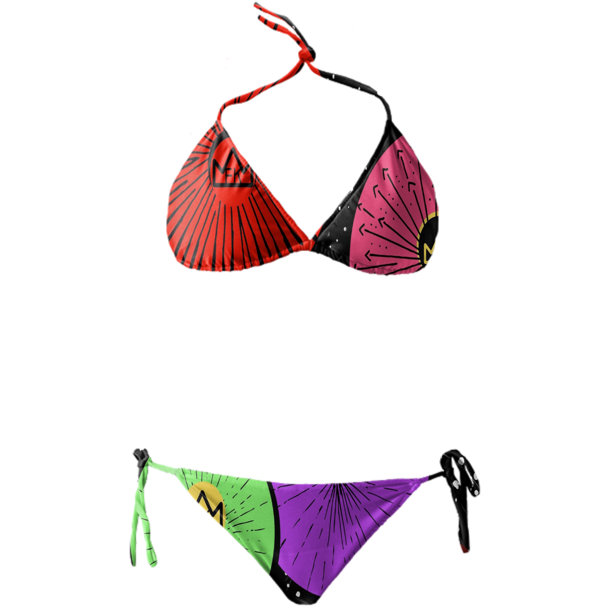 String bikini with ties at the neck bust and hips. Throw it in a bag and head to the beach!