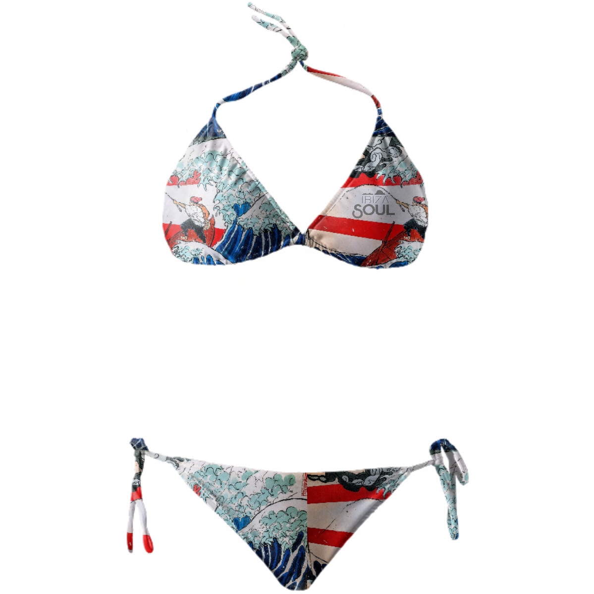 String bikini with ties at the neck bust and hips. Throw it in a bag and head to the beach!