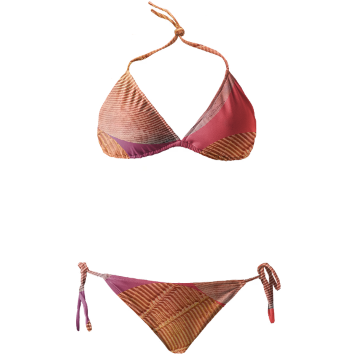 String bikini with ties at the neck bust and hips. Throw it in a bag and head to the beach!