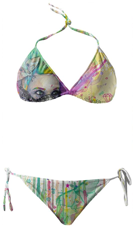 String bikini with ties at the neck bust and hips. Throw it in a bag and head to the beach!