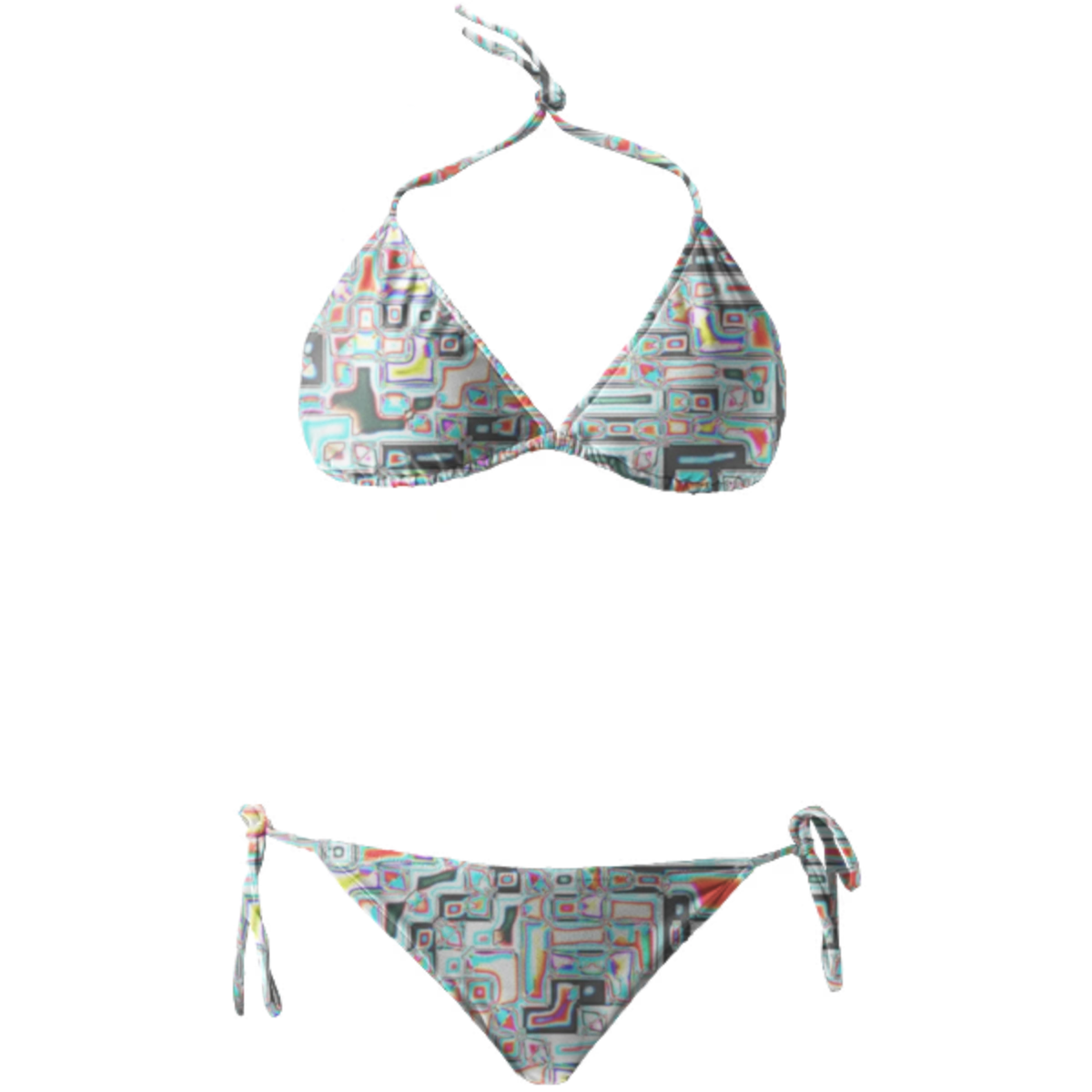 String bikini with ties at the neck bust and hips. Throw it in a bag and head to the beach!