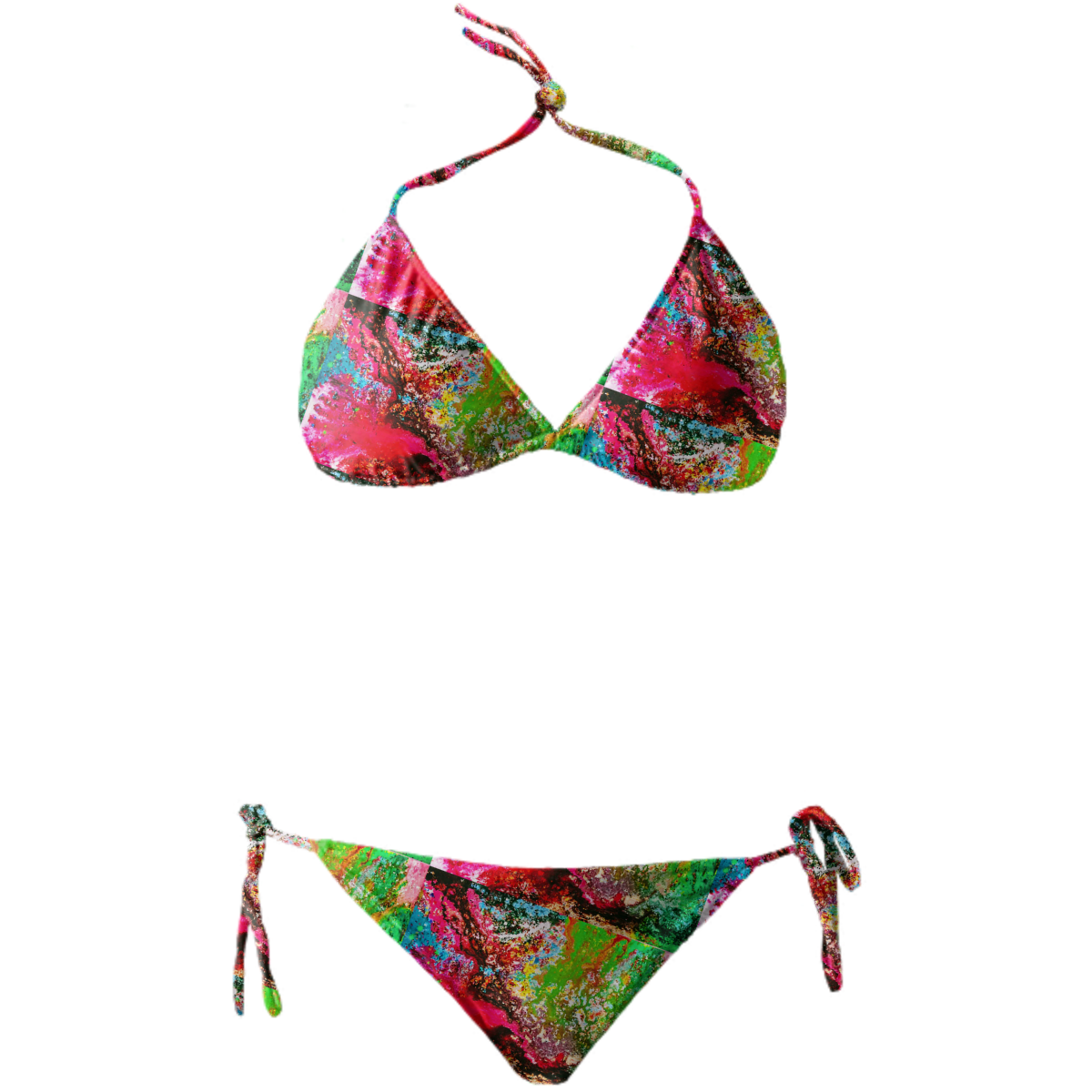 String bikini with ties at the neck bust and hips. Throw it in a bag and head to the beach!
