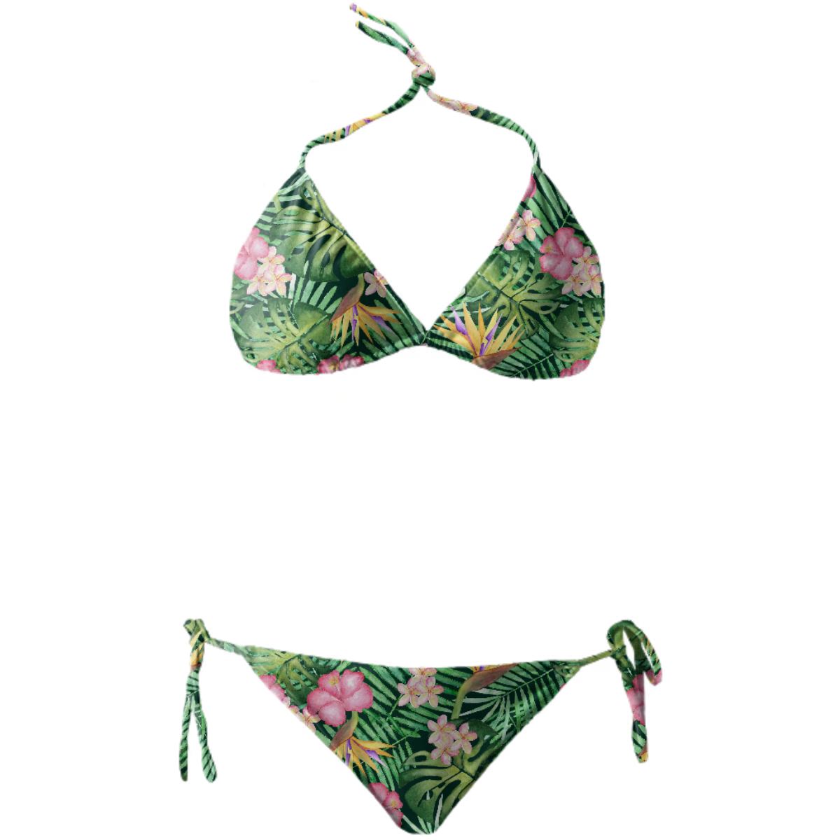 String bikini with ties at the neck bust and hips. Throw it in a bag and head to the beach!