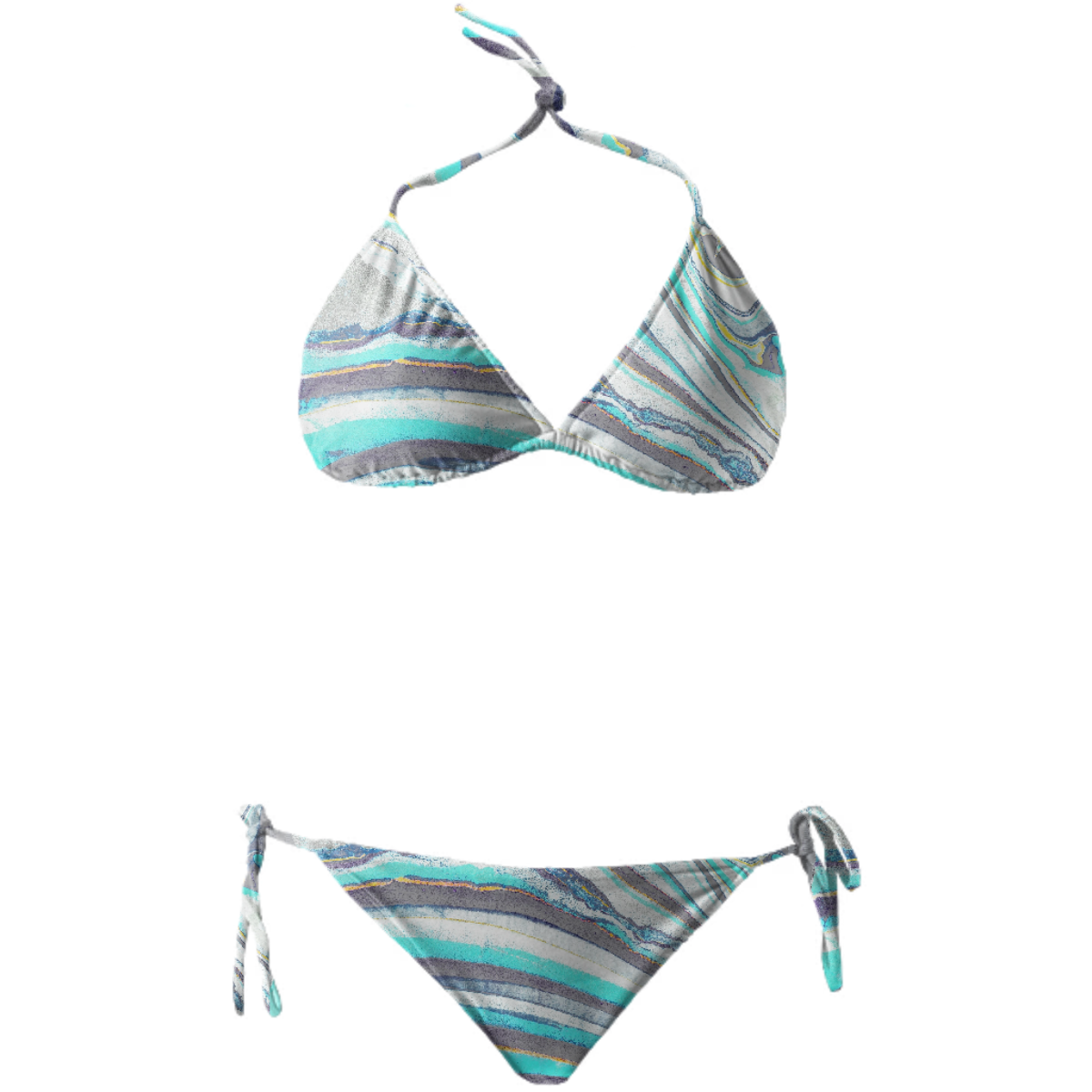 String bikini with ties at the neck bust and hips. Throw it in a bag and head to the beach!