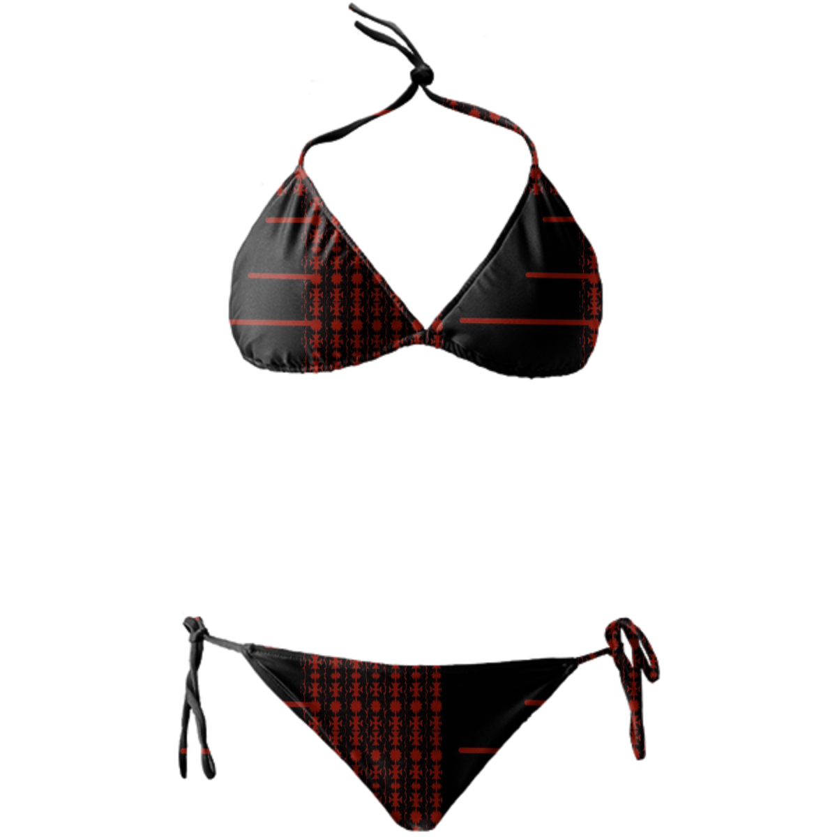 String bikini with ties at the neck bust and hips. Throw it in a bag and head to the beach!