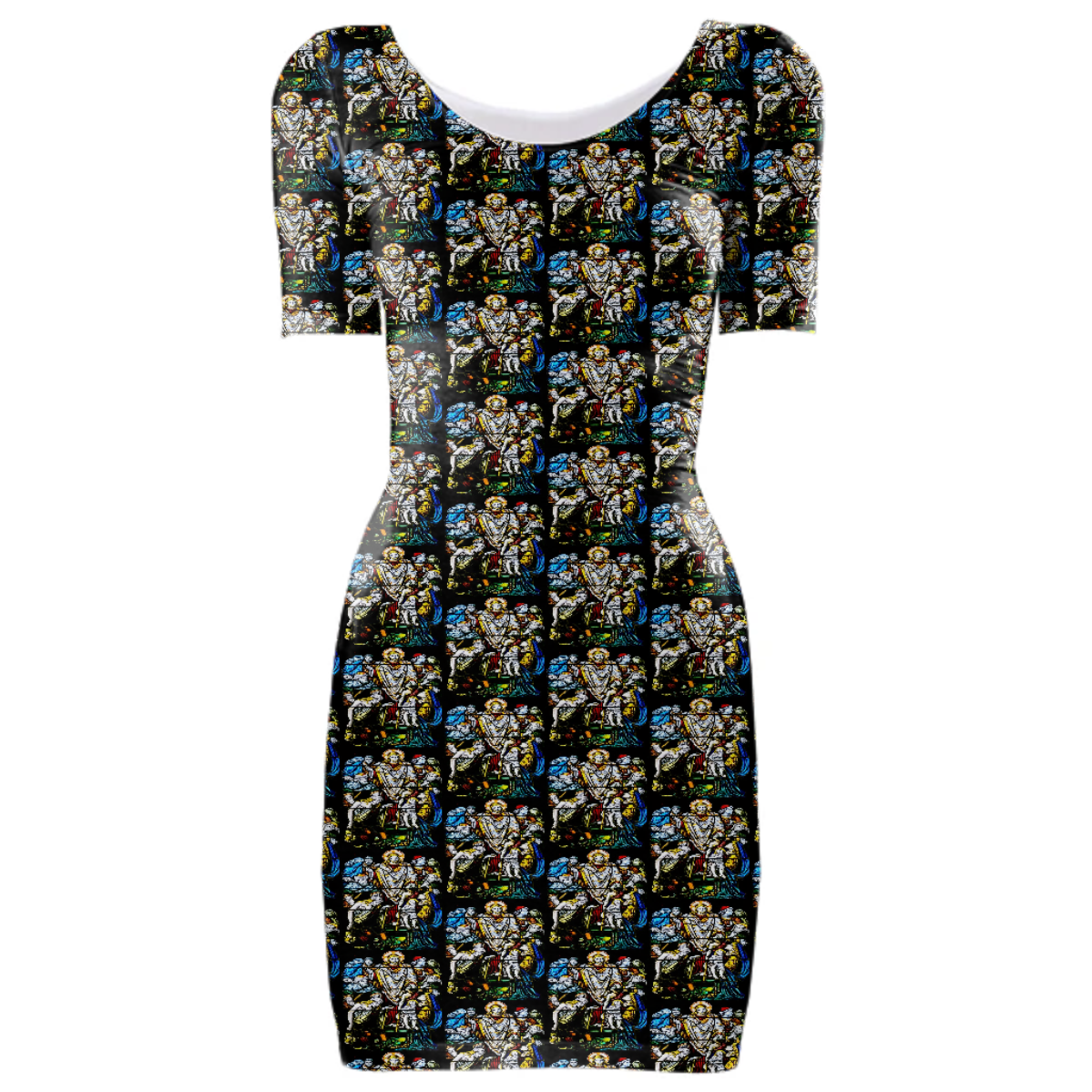 Tight fit scoop neck bodycon dress with set-in sleeves.