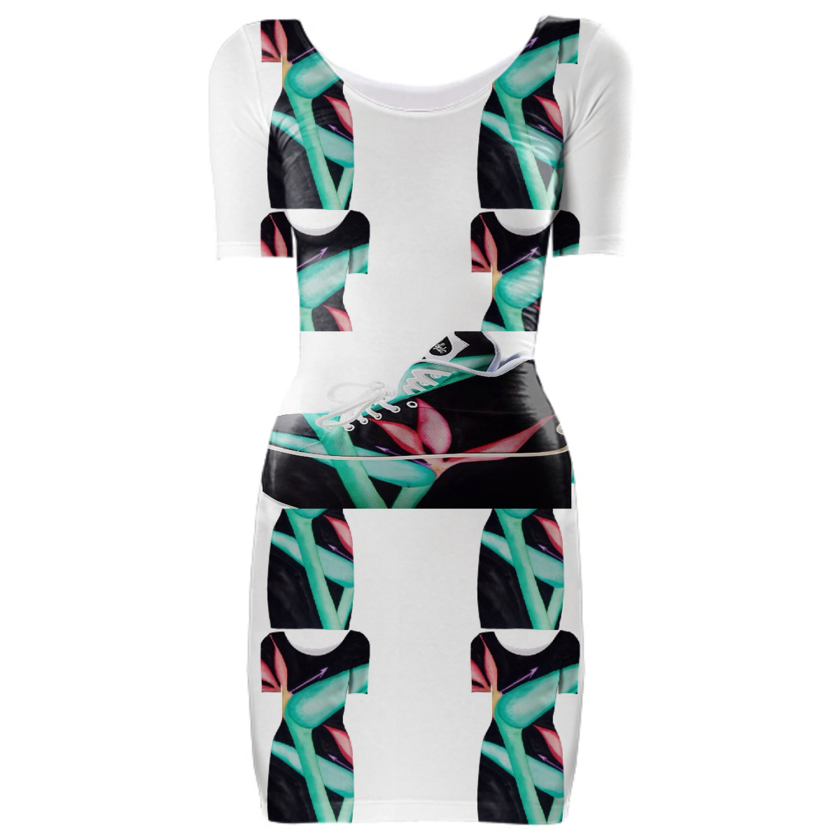 Tight fit scoop neck bodycon dress with set-in sleeves.
