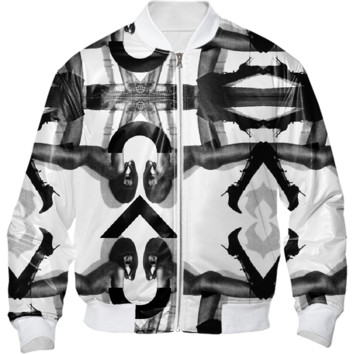 Light weight bombr jacket with your choice of white or black ribbing slight padding zip up front and side pockets. The inside is adorned with PAOM straps for swinging over your shoulders so you dont have to hold it.