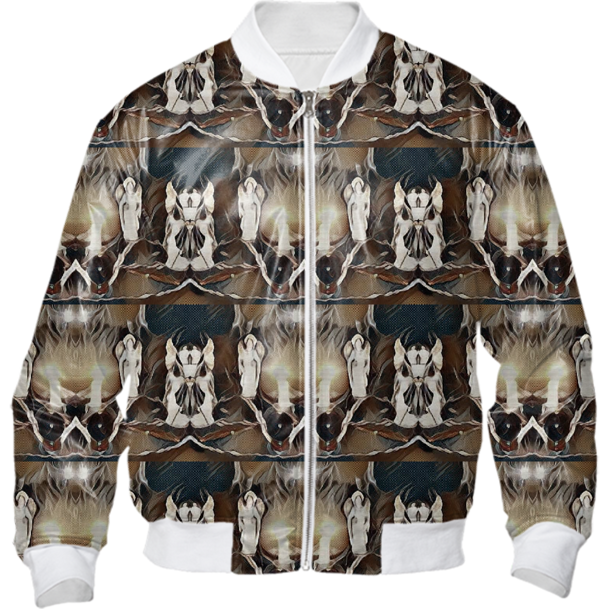 Light weight bombr jacket with your choice of white or black ribbing slight padding zip up front and side pockets. The inside is adorned with PAOM straps for swinging over your shoulders so you dont have to hold it.