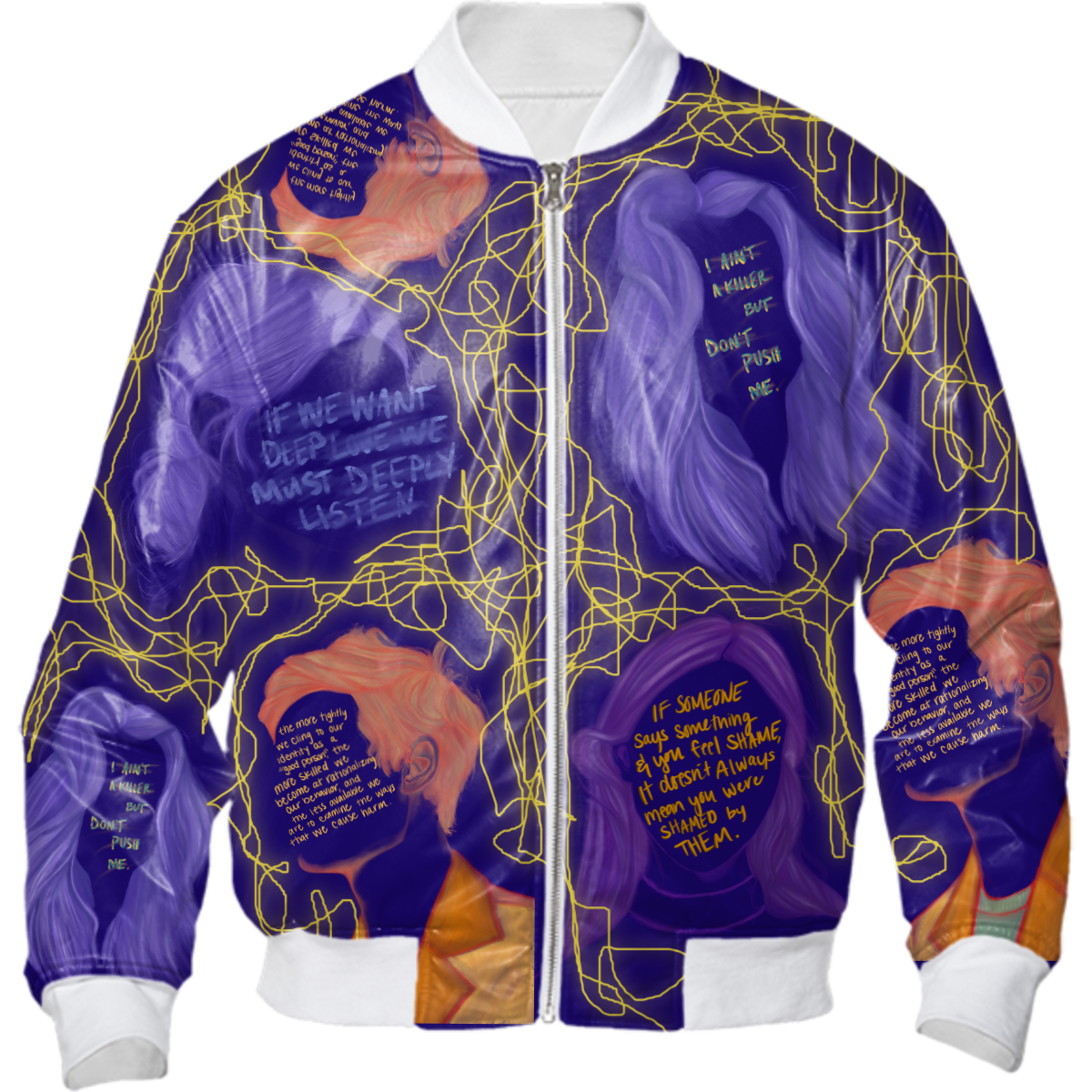 Light weight bombr jacket with your choice of white or black ribbing slight padding zip up front and side pockets. The inside is adorned with PAOM straps for swinging over your shoulders so you dont have to hold it.