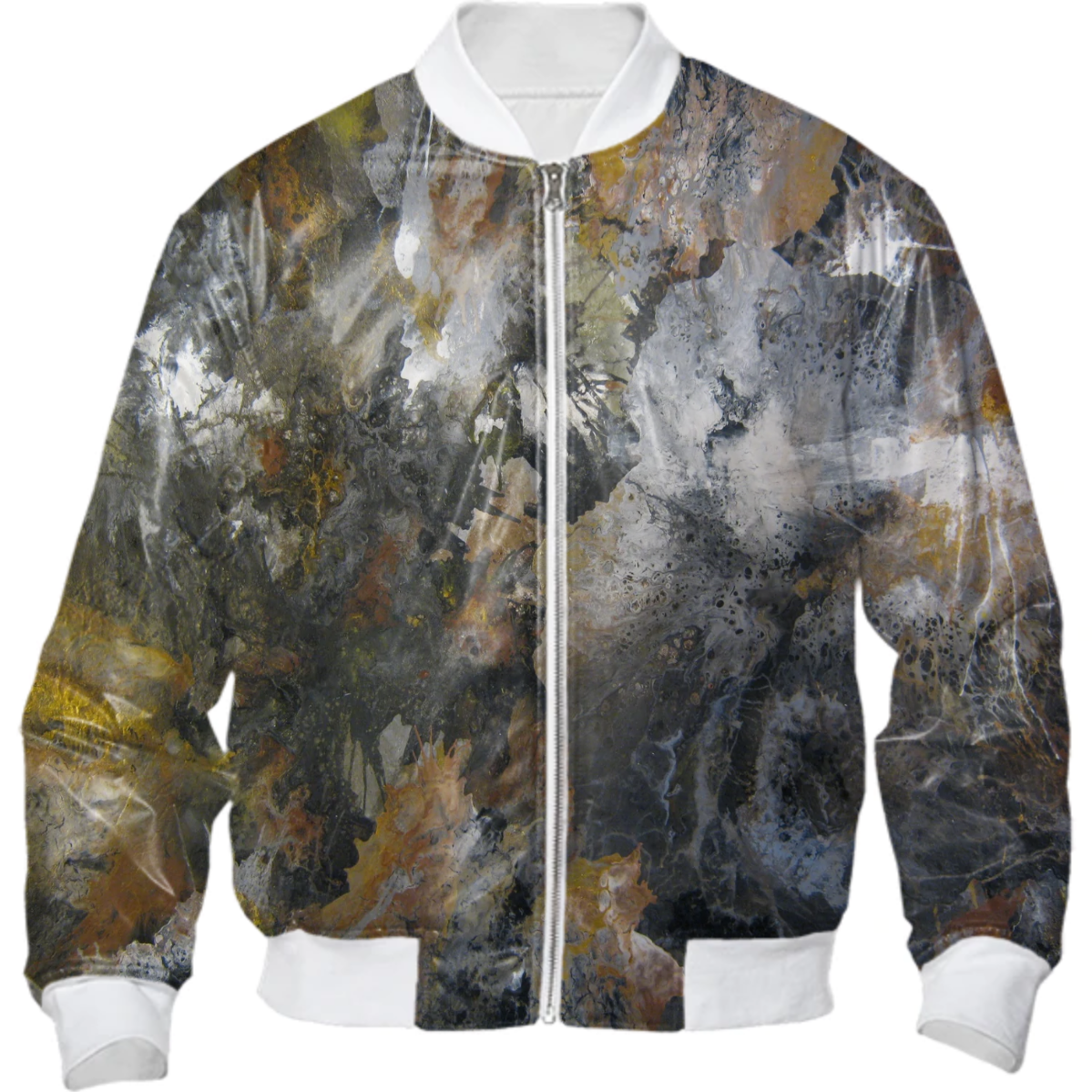 Light weight bombr jacket with your choice of white or black ribbing slight padding zip up front and side pockets. The inside is adorned with PAOM straps for swinging over your shoulders so you dont have to hold it.