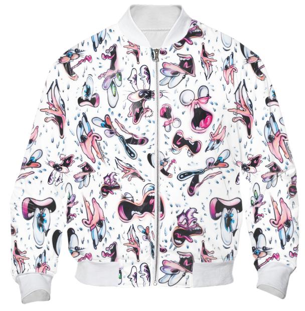 Light weight bombr jacket with your choice of white or black ribbing slight padding zip up front and side pockets. The inside is adorned with PAOM straps for swinging over your shoulders so you dont have to hold it.