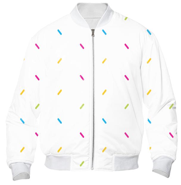 Light weight bombr jacket with your choice of white or black ribbing slight padding zip up front and side pockets. The inside is adorned with PAOM straps for swinging over your shoulders so you dont have to hold it.