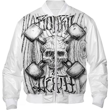 Light weight bombr jacket with your choice of white or black ribbing slight padding zip up front and side pockets. The inside is adorned with PAOM straps for swinging over your shoulders so you dont have to hold it.