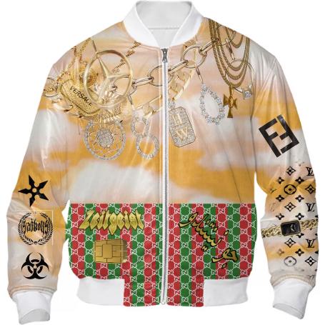 Light weight bombr jacket with your choice of white or black ribbing slight padding zip up front and side pockets. The inside is adorned with PAOM straps for swinging over your shoulders so you dont have to hold it.