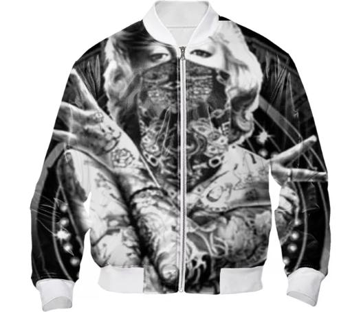 Light weight bombr jacket with your choice of white or black ribbing slight padding zip up front and side pockets. The inside is adorned with PAOM straps for swinging over your shoulders so you dont have to hold it.