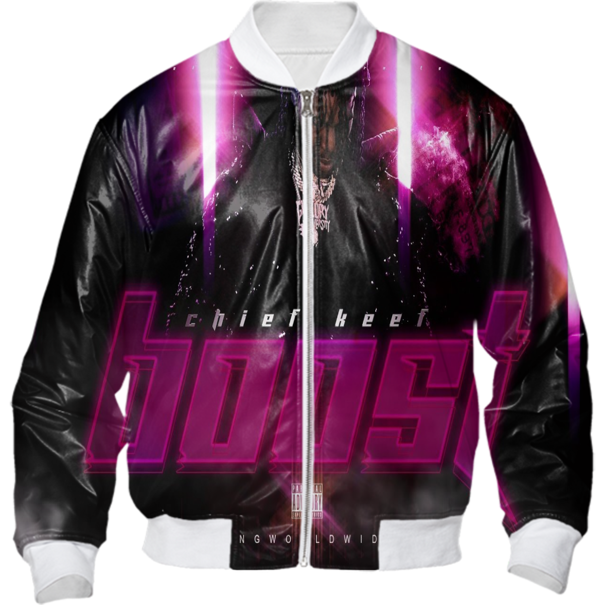 Light weight bombr jacket with your choice of white or black ribbing slight padding zip up front and side pockets. The inside is adorned with PAOM straps for swinging over your shoulders so you dont have to hold it.