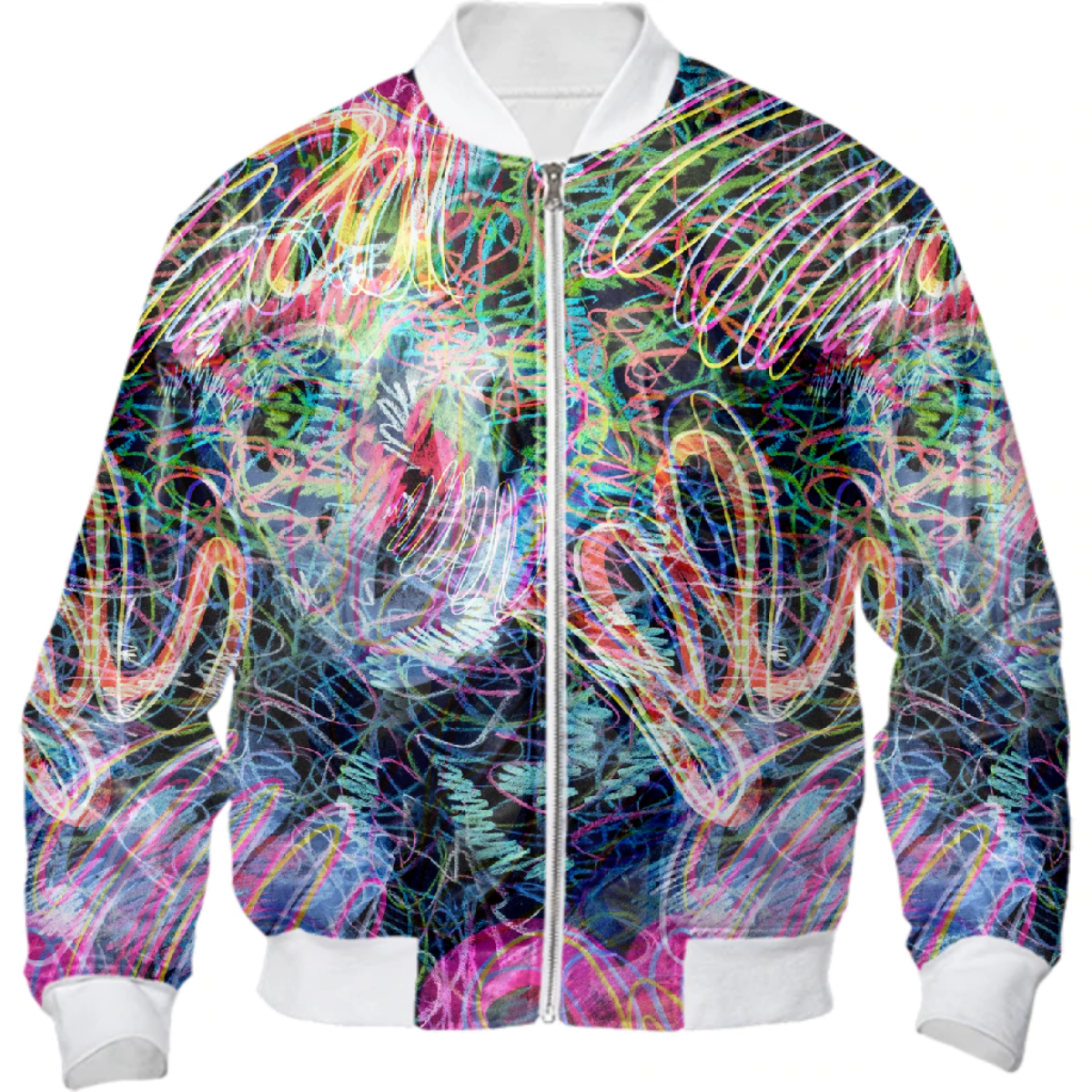 Light weight bombr jacket with your choice of white or black ribbing slight padding zip up front and side pockets. The inside is adorned with PAOM straps for swinging over your shoulders so you dont have to hold it.