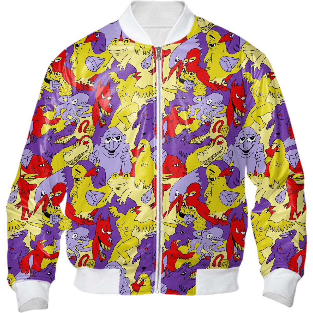 Light weight bombr jacket with your choice of white or black ribbing slight padding zip up front and side pockets. The inside is adorned with PAOM straps for swinging over your shoulders so you dont have to hold it.