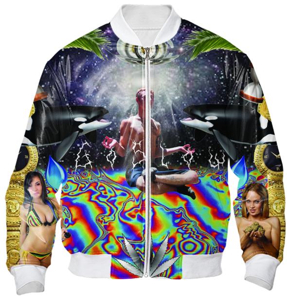 Light weight bombr jacket with your choice of white or black ribbing slight padding zip up front and side pockets. The inside is adorned with PAOM straps for swinging over your shoulders so you dont have to hold it.
