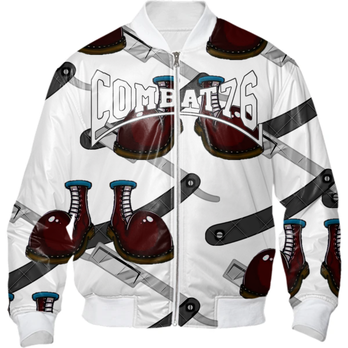 Light weight bombr jacket with your choice of white or black ribbing slight padding zip up front and side pockets. The inside is adorned with PAOM straps for swinging over your shoulders so you dont have to hold it.