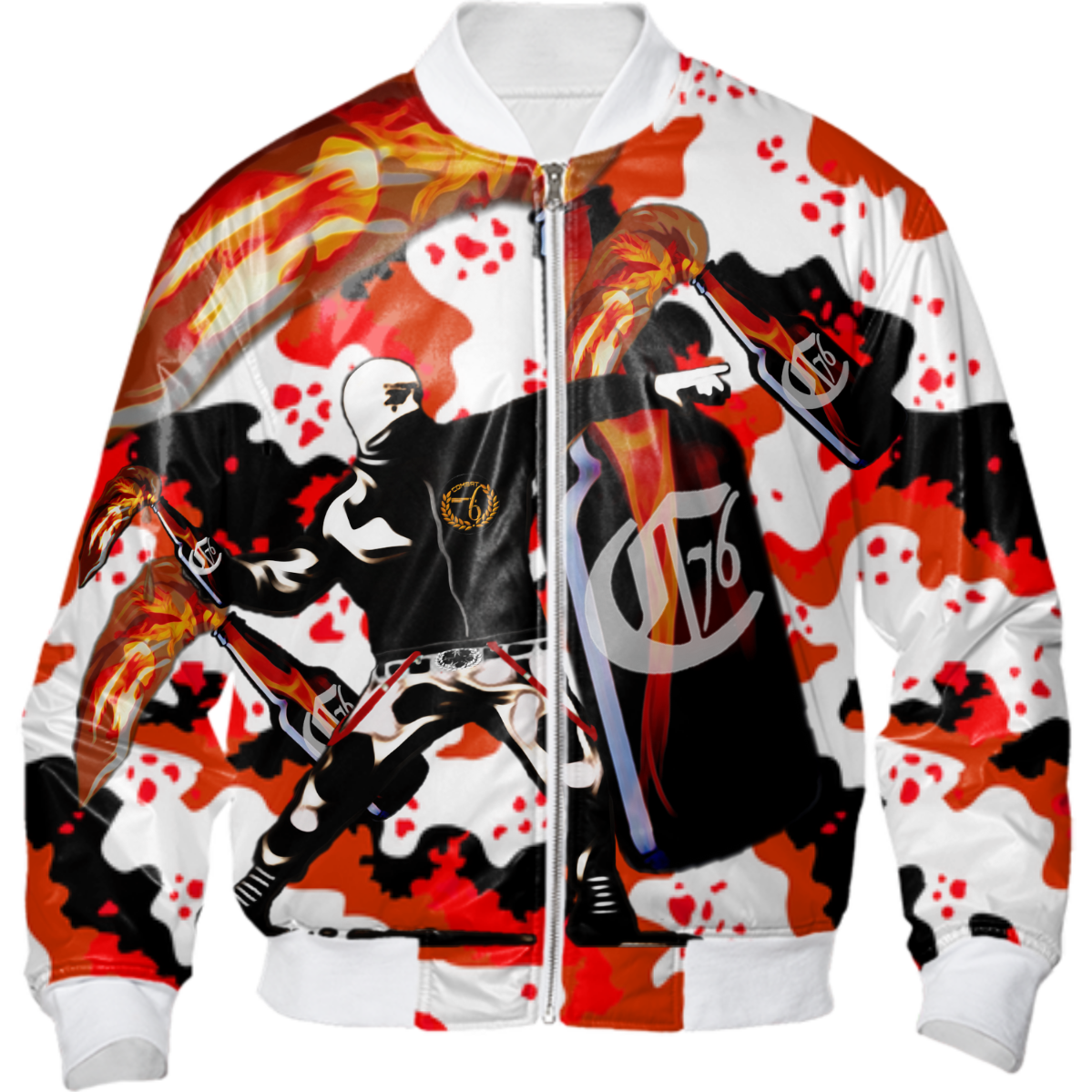 Light weight bombr jacket with your choice of white or black ribbing slight padding zip up front and side pockets. The inside is adorned with PAOM straps for swinging over your shoulders so you dont have to hold it.