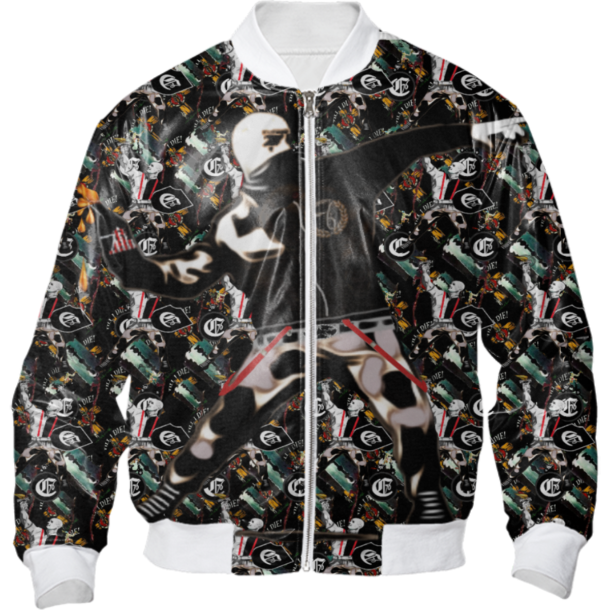 Light weight bombr jacket with your choice of white or black ribbing slight padding zip up front and side pockets. The inside is adorned with PAOM straps for swinging over your shoulders so you dont have to hold it.