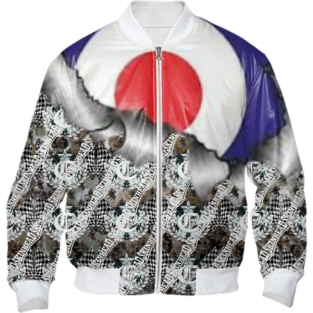 Light weight bombr jacket with your choice of white or black ribbing slight padding zip up front and side pockets. The inside is adorned with PAOM straps for swinging over your shoulders so you dont have to hold it.