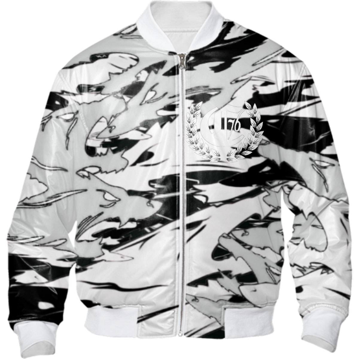 Light weight bombr jacket with your choice of white or black ribbing slight padding zip up front and side pockets. The inside is adorned with PAOM straps for swinging over your shoulders so you dont have to hold it.