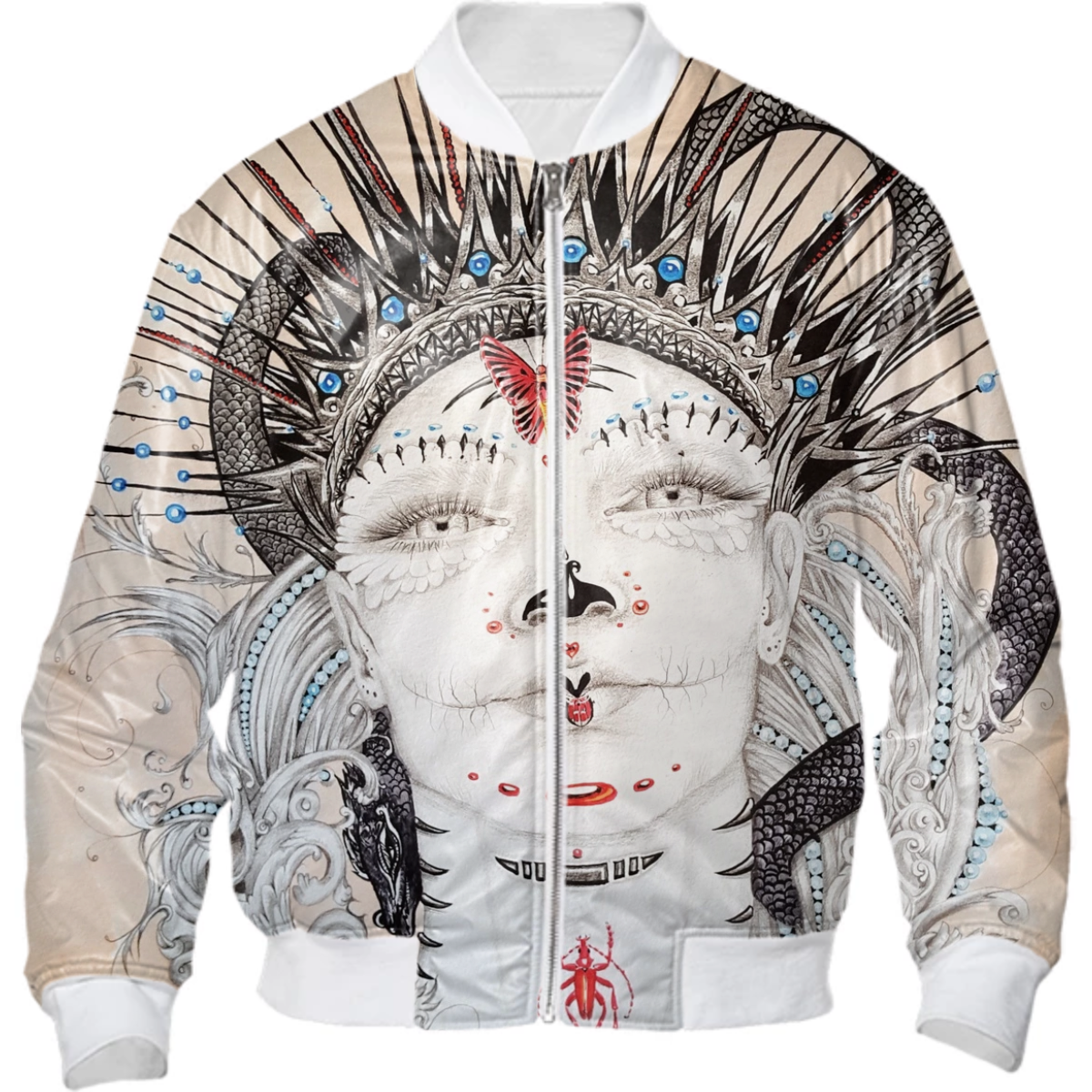 Light weight bombr jacket with your choice of white or black ribbing slight padding zip up front and side pockets. The inside is adorned with PAOM straps for swinging over your shoulders so you dont have to hold it.