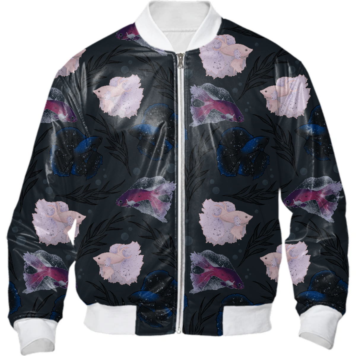 Light weight bombr jacket with your choice of white or black ribbing slight padding zip up front and side pockets. The inside is adorned with PAOM straps for swinging over your shoulders so you dont have to hold it.