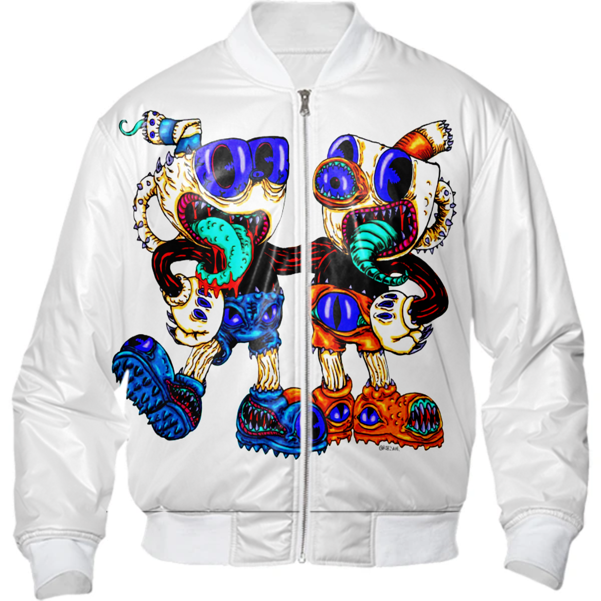 Light weight bombr jacket with your choice of white or black ribbing slight padding zip up front and side pockets. The inside is adorned with PAOM straps for swinging over your shoulders so you dont have to hold it.