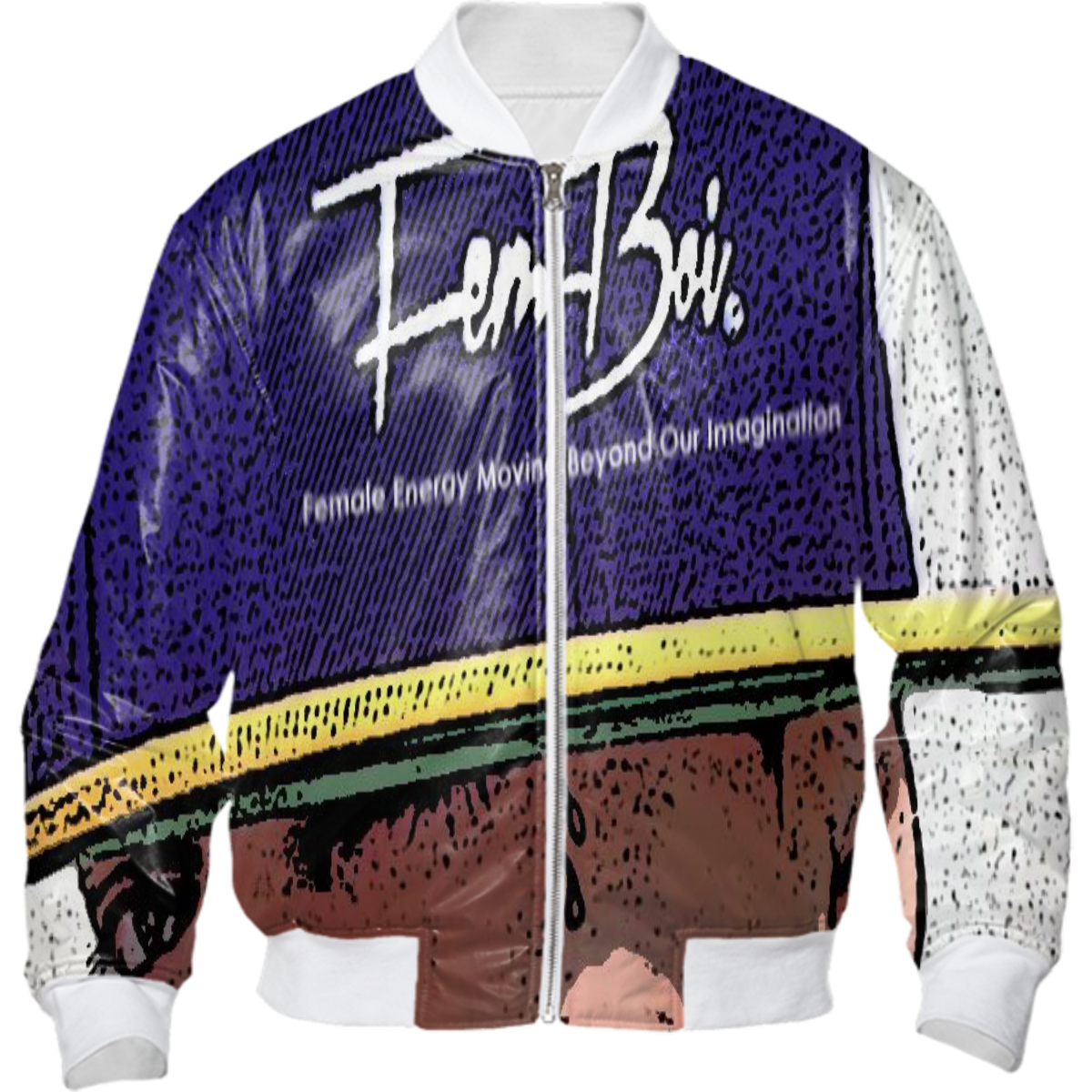 Light weight bombr jacket with your choice of white or black ribbing slight padding zip up front and side pockets. The inside is adorned with PAOM straps for swinging over your shoulders so you dont have to hold it.