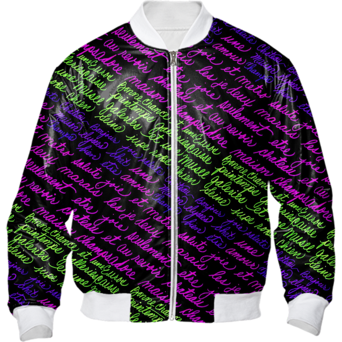 Light weight bombr jacket with your choice of white or black ribbing slight padding zip up front and side pockets. The inside is adorned with PAOM straps for swinging over your shoulders so you dont have to hold it.