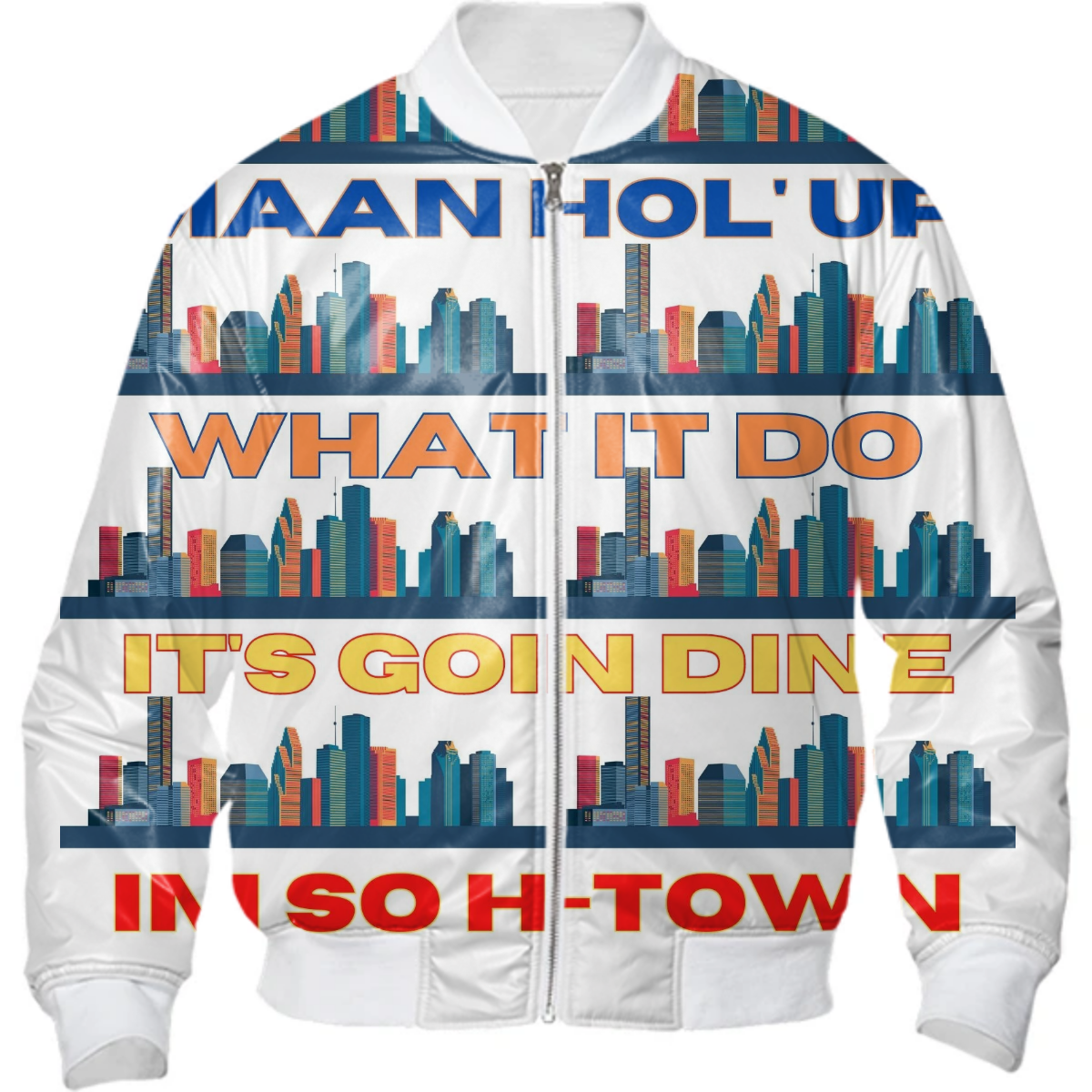 Light weight bombr jacket with your choice of white or black ribbing slight padding zip up front and side pockets. The inside is adorned with PAOM straps for swinging over your shoulders so you dont have to hold it.