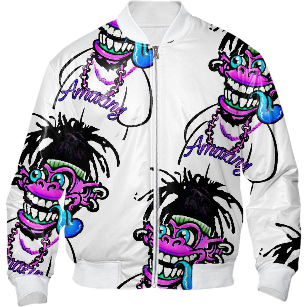 Light weight bombr jacket with your choice of white or black ribbing slight padding zip up front and side pockets. The inside is adorned with PAOM straps for swinging over your shoulders so you dont have to hold it.