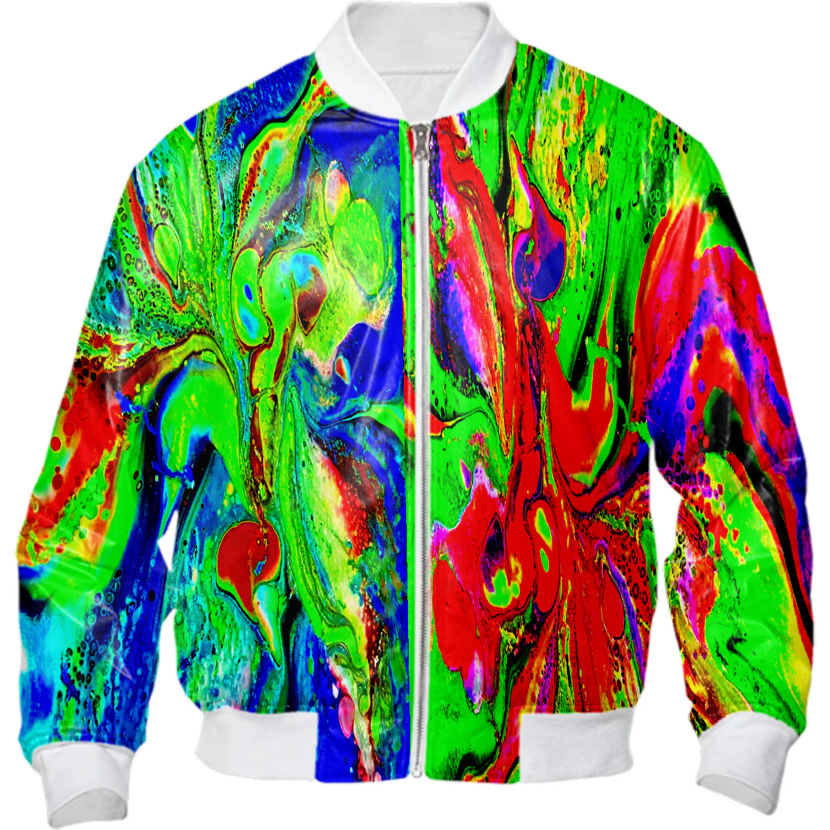 Light weight bombr jacket with your choice of white or black ribbing slight padding zip up front and side pockets. The inside is adorned with PAOM straps for swinging over your shoulders so you dont have to hold it.