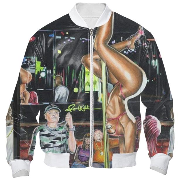 Light weight bombr jacket with your choice of white or black ribbing slight padding zip up front and side pockets. The inside is adorned with PAOM straps for swinging over your shoulders so you dont have to hold it.