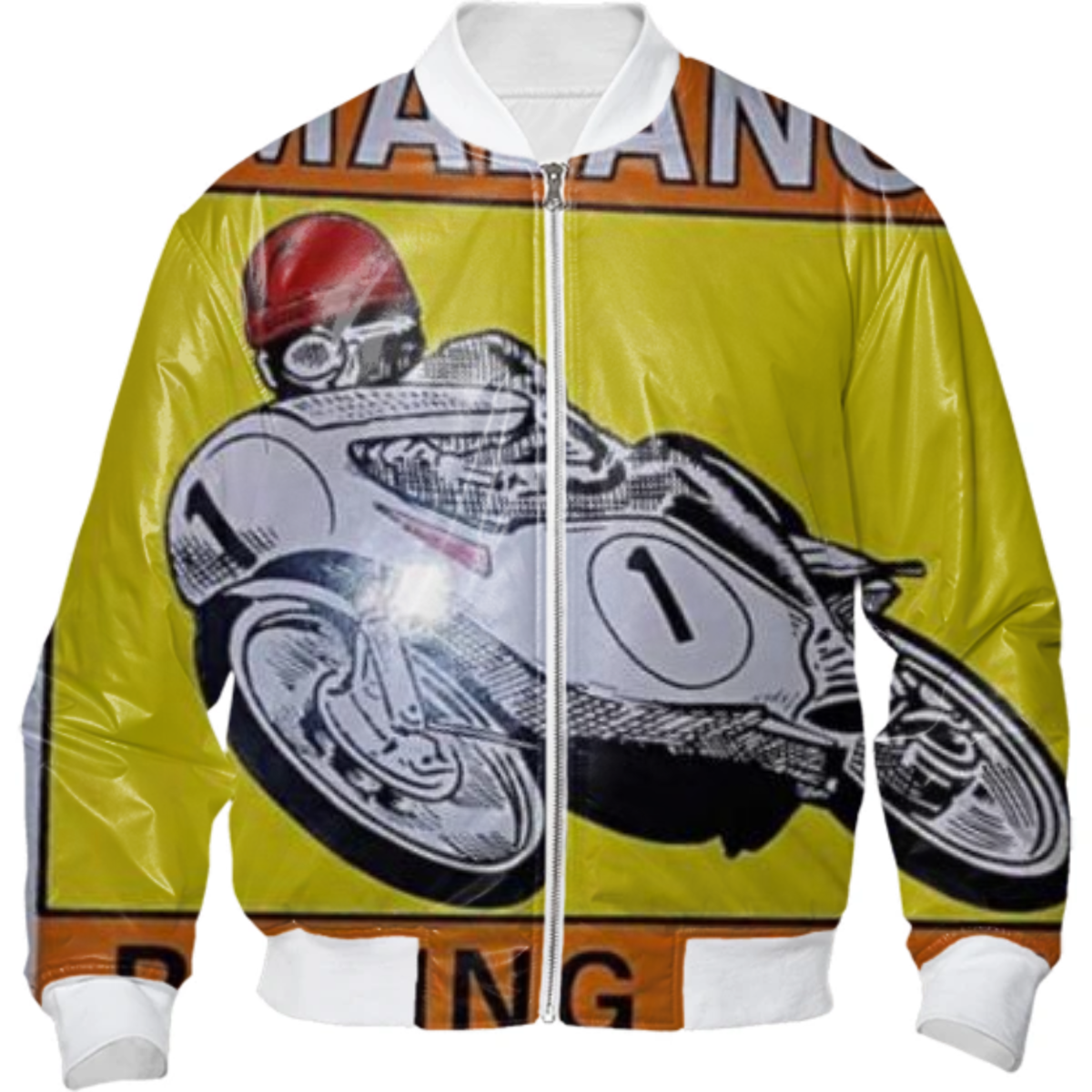 Light weight bombr jacket with your choice of white or black ribbing slight padding zip up front and side pockets. The inside is adorned with PAOM straps for swinging over your shoulders so you dont have to hold it.