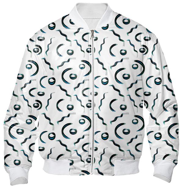 Light weight bombr jacket with your choice of white or black ribbing slight padding zip up front and side pockets. The inside is adorned with PAOM straps for swinging over your shoulders so you dont have to hold it.