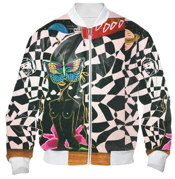 Light weight bombr jacket with your choice of white or black ribbing slight padding zip up front and side pockets. The inside is adorned with PAOM straps for swinging over your shoulders so you dont have to hold it.