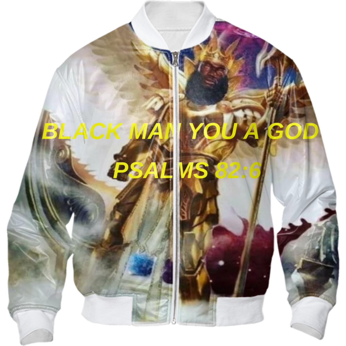 Light weight bombr jacket with your choice of white or black ribbing slight padding zip up front and side pockets. The inside is adorned with PAOM straps for swinging over your shoulders so you dont have to hold it.