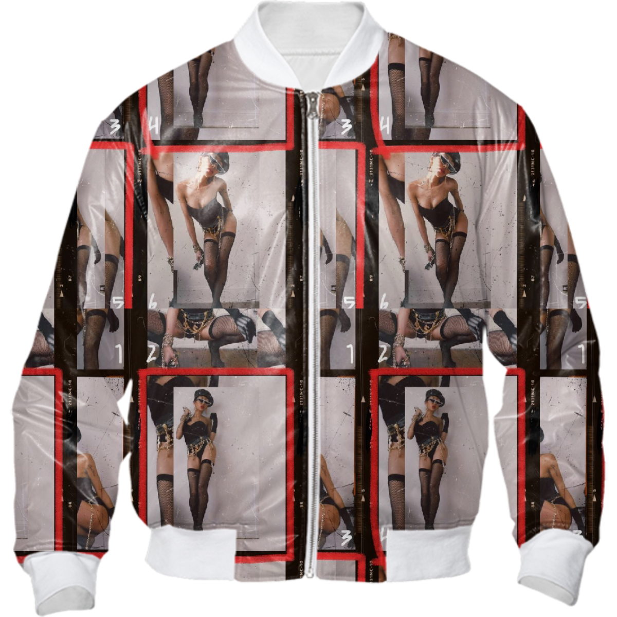 Light weight bombr jacket with your choice of white or black ribbing slight padding zip up front and side pockets. The inside is adorned with PAOM straps for swinging over your shoulders so you dont have to hold it.
