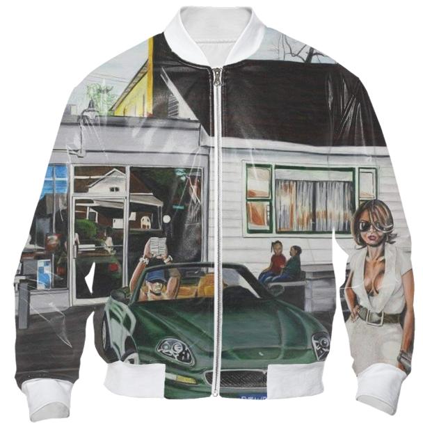 Light weight bombr jacket with your choice of white or black ribbing slight padding zip up front and side pockets. The inside is adorned with PAOM straps for swinging over your shoulders so you dont have to hold it.