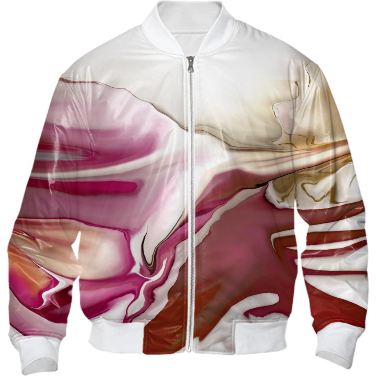Light weight bombr jacket with your choice of white or black ribbing slight padding zip up front and side pockets. The inside is adorned with PAOM straps for swinging over your shoulders so you dont have to hold it.