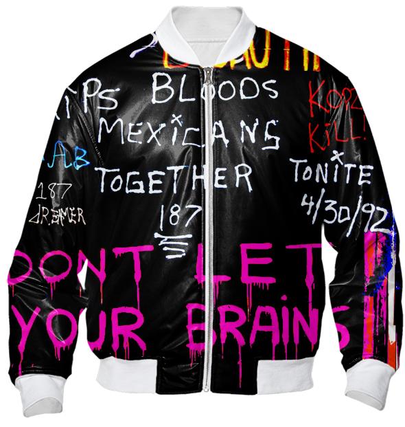 Light weight bombr jacket with your choice of white or black ribbing slight padding zip up front and side pockets. The inside is adorned with PAOM straps for swinging over your shoulders so you dont have to hold it.