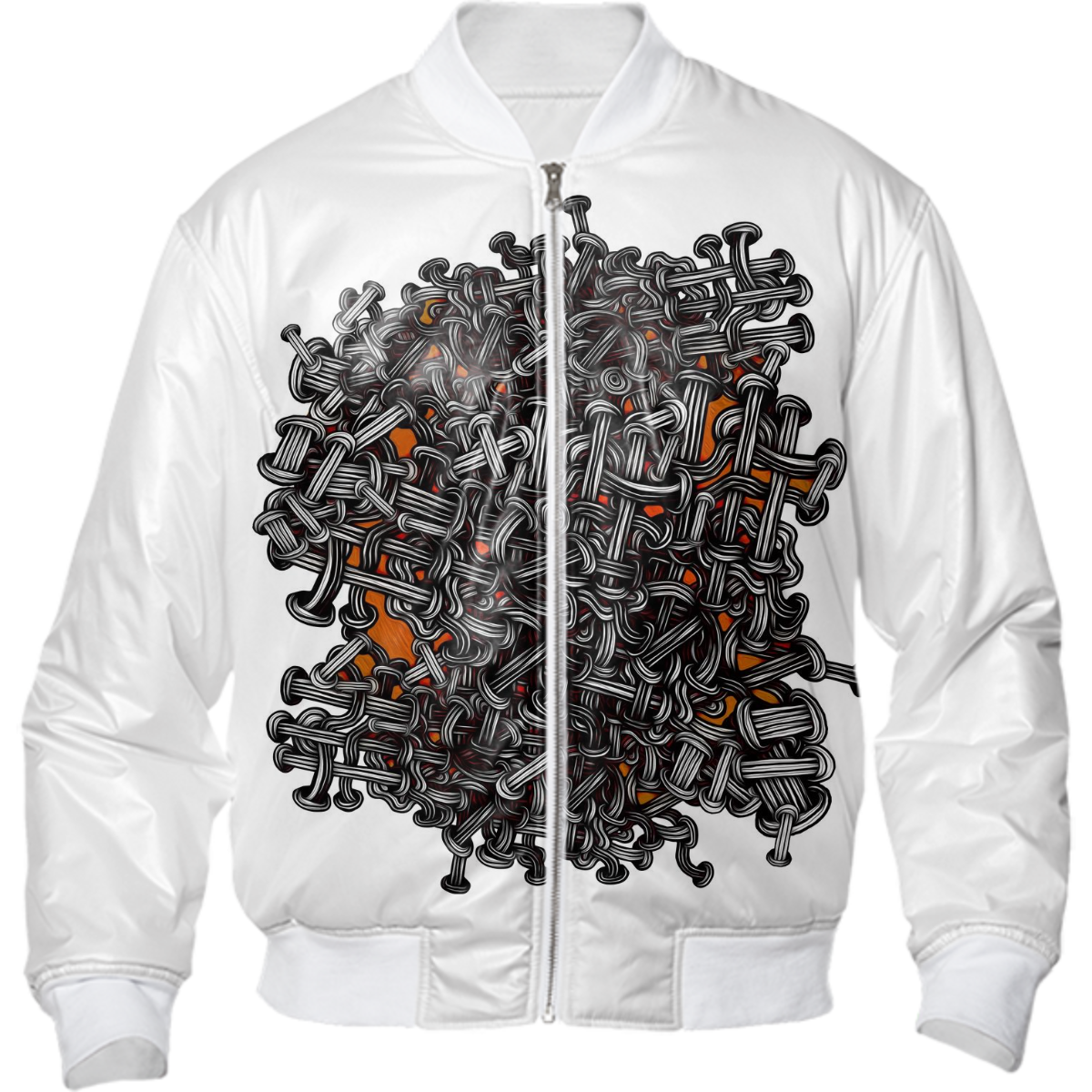 Light weight bombr jacket with your choice of white or black ribbing slight padding zip up front and side pockets. The inside is adorned with PAOM straps for swinging over your shoulders so you dont have to hold it.