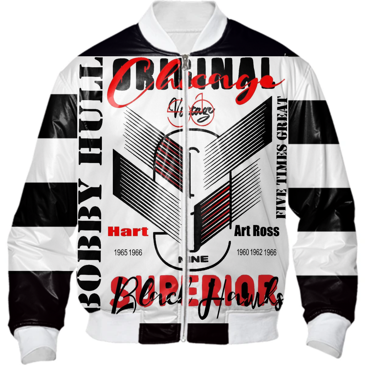 Light weight bombr jacket with your choice of white or black ribbing slight padding zip up front and side pockets. The inside is adorned with PAOM straps for swinging over your shoulders so you dont have to hold it.