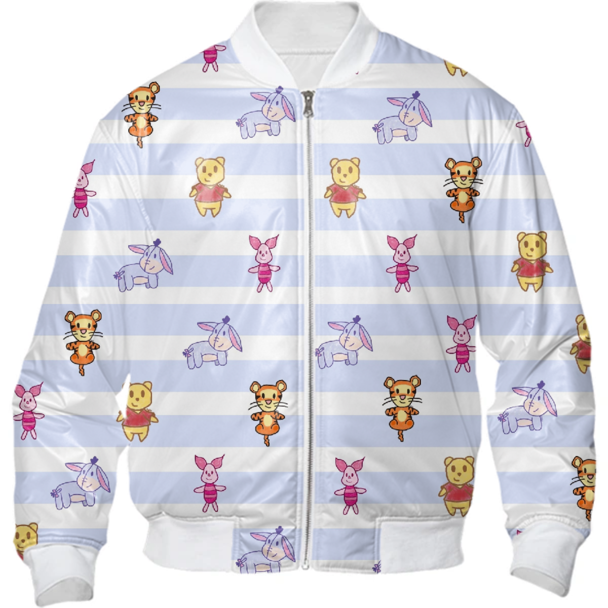 Light weight bombr jacket with your choice of white or black ribbing slight padding zip up front and side pockets. The inside is adorned with PAOM straps for swinging over your shoulders so you dont have to hold it.