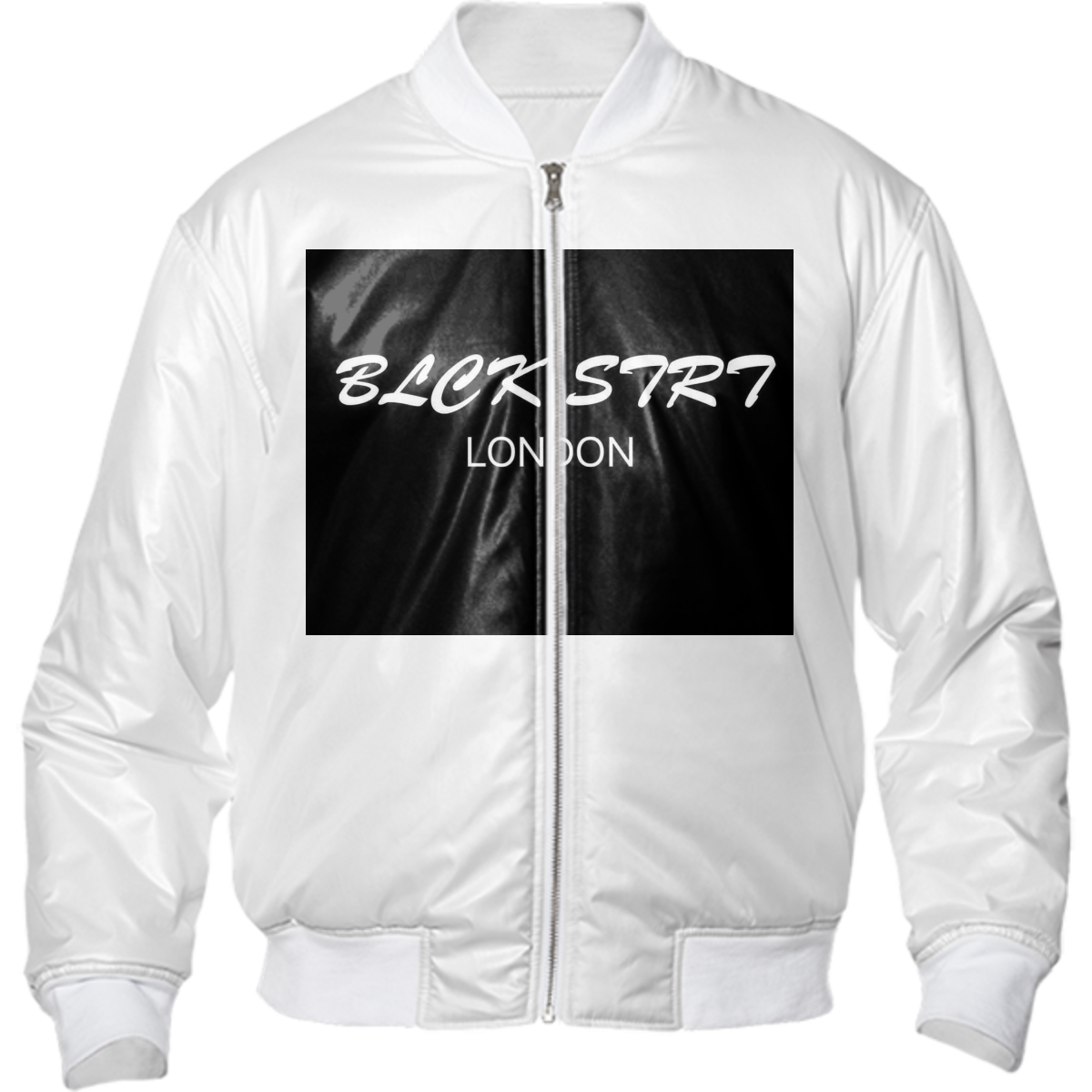 Light weight bombr jacket with your choice of white or black ribbing slight padding zip up front and side pockets. The inside is adorned with PAOM straps for swinging over your shoulders so you dont have to hold it.